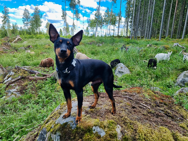 "Harri on englannin kääpiöterrieri. Jotkut sanovat tuollaista rottakoiraksi. Jos se rotille pärjää, niin eiköhän se pidä kurissa myös isommatkin pedot. Niin ainakin toivon."