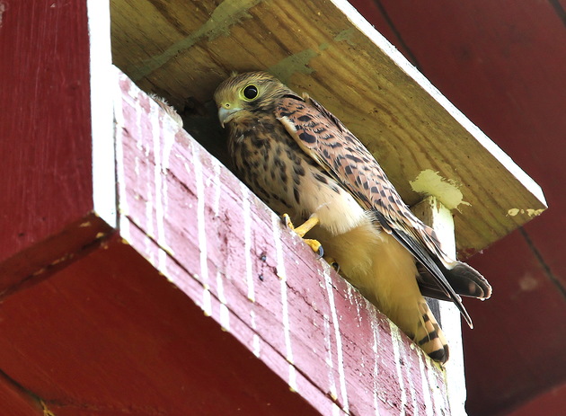 Kun me syömme suulin päädyssä ruohoa, meitä tarkkaillaan. Komea tuulihaukka istuu korkealle aivan harjan alle sijoitetun pesälaatikkonsa reunalla. Poikasiakin siellä on. Äänet kuuluvat, mutta ketään ei reunan takaa näe. Niinpä en osaa kertoa, montako uutta tuulihaukkaa siellä on kasvamassa.