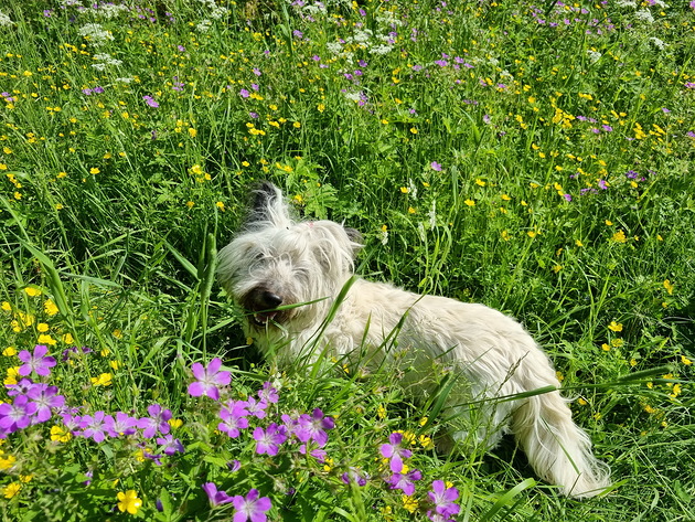 Zorro on skyenterrieri. Sillä on vahvat leuat ja isot hampaat. Se lähti mielellään mukaani, sillä Zorrokin tykkää kukista, vaikka ei syökään niitä."