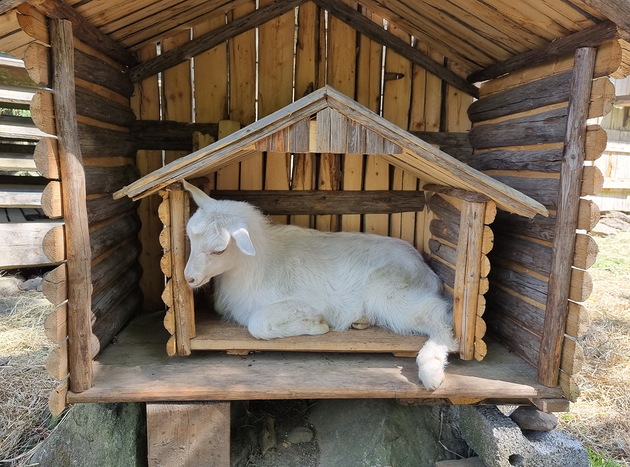 "Alli-kili löysi varjoisan paikan pihalle jääneen jouluseimen sisältä. Pienihän tuo tietysti Allille alkaa jo olla, mutta onpahan sitä ilmavampi, kun etuseinää ei ole lainkaan. Kasvuvaraakin löytyy. Kun pieni seimitalli otetaan ja pois, niin taas mahtuu Alli koipiaan oikomaan ilman, että sorkat raapivat seiniä!"