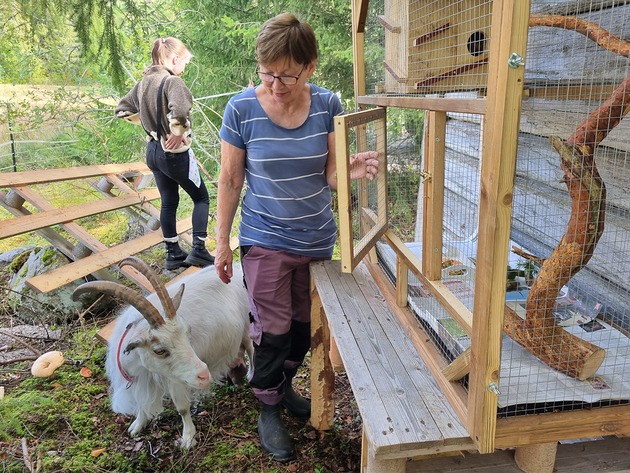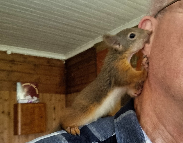 Oravien häkki vietiin mökkeineen ja kiipeilypuineen yli satavuotiaan aitan seinustalle isojen kuusien suojaa. Lahja-kuttu oli mukana muuttopuuhissa. Se tykkää niin valtavasti Kaija-emännästä, että haluaa olla aina samoissa touhuissa hänen kanssaan.