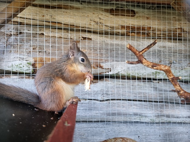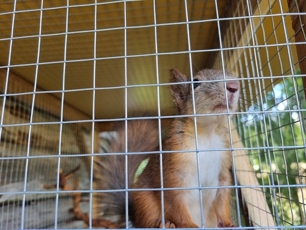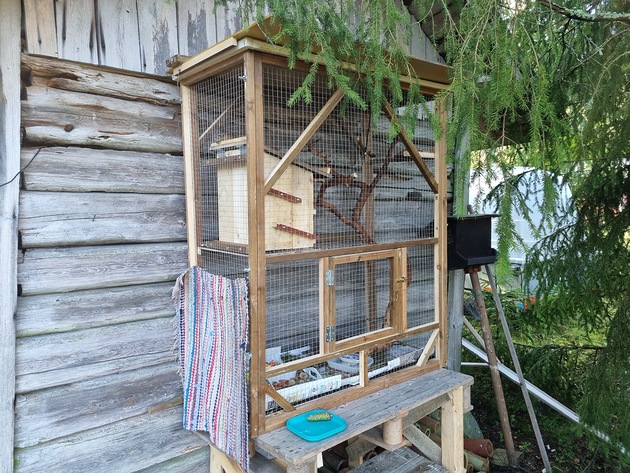 Varmuuden vuoksi oravien häkki laitettiin pienen telineen päällle, etteivät isommat nelijalkaiset pääse verkkkojen kestävyyttä kokeilemaan.