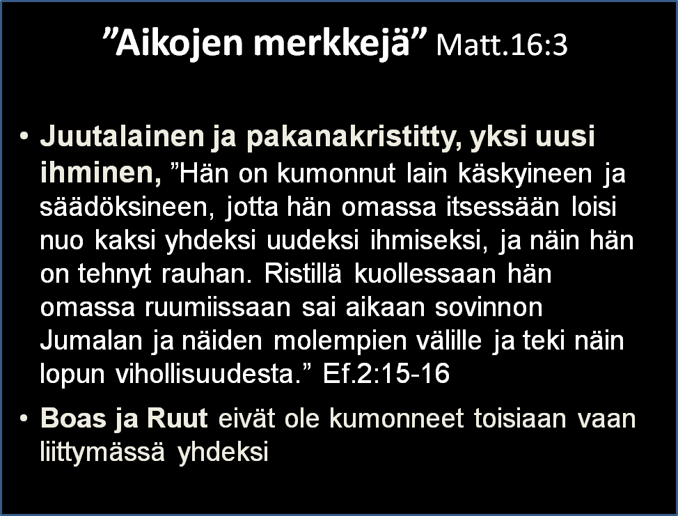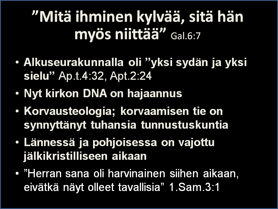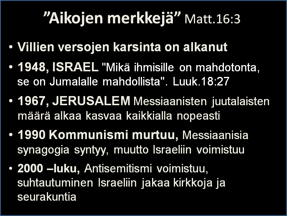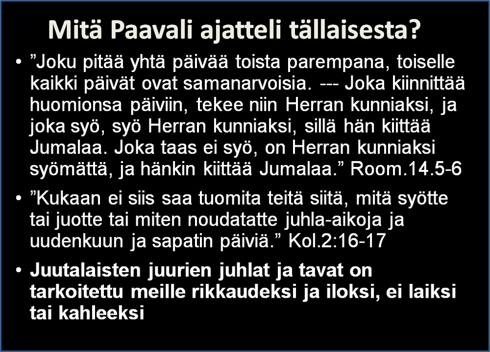 Iloitaan kiitollisin ja vapain mielin juutalaisista juurista juhlineen ja muine aarteineen, mutta ei tehdä siitä lakia, joka ryhtyy lajittelemaan Jeesukseen uskovia ja hänen laumaansa kuuluvia eri karsinoihin sen mukaan, miten itse kukin juhlia viettää tai on viettämättä.