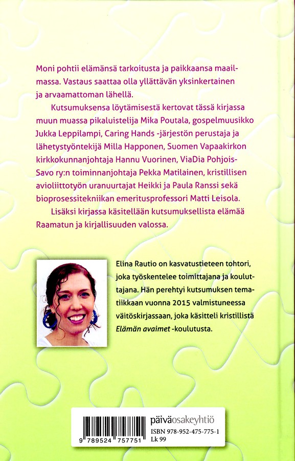 Kannen lisäteksti Tarinoita kutsumuksesta ja sen löytämisestä jättää kertomatta kirjan toisen merkittävän alueen. Hyvien tarinoiden lisäksi kirja tarjoaa käytännöllisen ja selkeän askel askeleelta oppaan oman kutsumuksen ja palvelutehtävän löytämiseen.