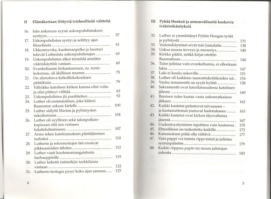 Kirjassa on neljä osaa, joissa on lyhyitä muutaman sivun mittaisia lukuja. Niitä on yhteensä peräti 66 kappaletta. Otsikoiksi on poimittu Lutheria koskevia väärinkäsityksiä ja virheellisiä tulkintoja. Niinpä jo pelkkä kirjan sisällysluettelo on melkoinen lukukokemus.
