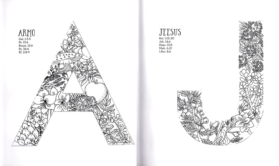 Värityssivut ovat kirjan alussa. Eikä värikyniä käyttäville ole tarjolla väritettäväksi mitä tahansa kukkia tai keijukaisia. Kirjaimen muotoon piirretyt värityskuvat julistavat hienostuneella tavalla Raamatun tärkeintä sanomaa. Ensimmäisellä sivulla on A niin kuin ARMO, seuraavalla J niin kuin JEESUS, sitten O ja sen keskellä teksti ONNENI ON OLLA HERRAA LÄHELLÄ, seuraavaksi R niin kuin RUKOUS jne. Jokaisen suuren kirjaimen vieressä on sanan alle listattuna muutamia kyseisestä asiasta kertovia raamatunkohtia.