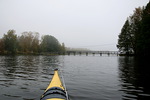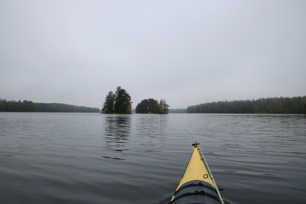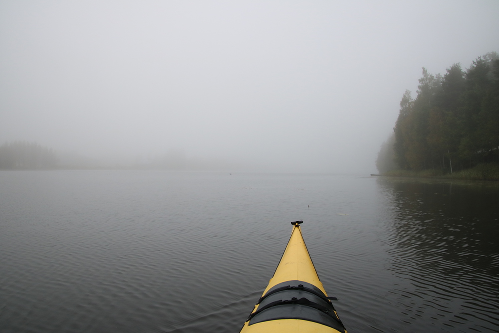 Säätiedotus lupasi aamupäiväksi puolipilvistä. Vasta iltapäivällä aurinko jäisi tyystin pilvien taa, ja seuraavaksi alkaisi taas sataa. Lähtiessäni Vesarannasta Houhajärvelle näkyvissä ei ollut sen enempää pilviä kuin aurinkoakaan. Oli vain sakea sumu. Tuntui kuin olisin lähtenyt melontaretkelle harmaaseen villasukkaan. Vaan sumullapa oli varattuna melojalle monta mukavaa yllätystä.