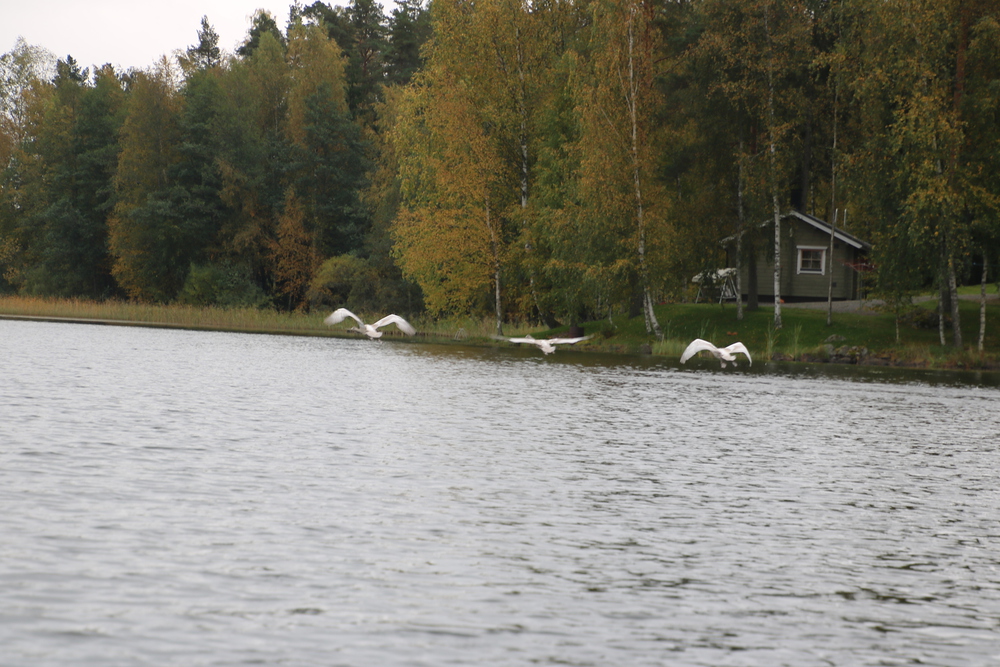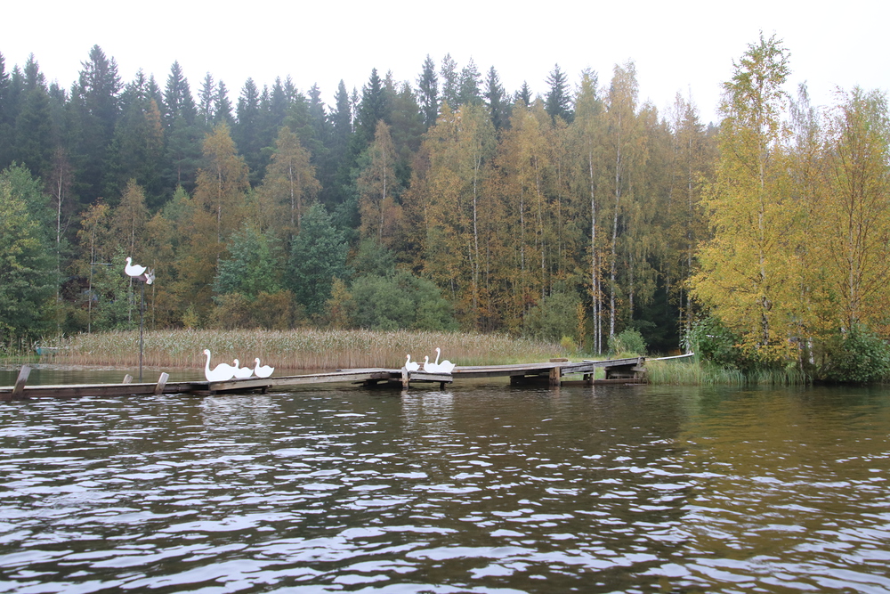 Erään mökin laiturille oli tehty puusta joutsenet,...