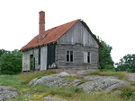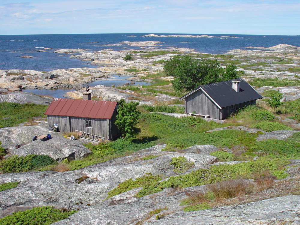 Vanhoja entisöityjä kalastusmajoja ulkoluodolla