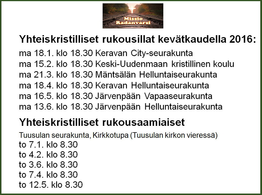 Maanantaina 30.11. pidetyssä palaverissa sovittiin rukousiltojen jatkamisesta myös kevätkaudella 2016. Rukousiltoja järjestetään kerran kuukaudessa. Päivämäärät ja paikat löydät ohessa olevasta kuvasta, jonka voit kopioida koneellesi tai kännykkääsi sekä jakaa ystävillesi.