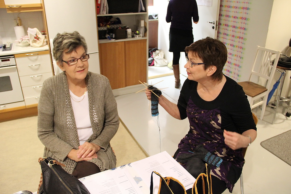 Kahvitauolla Terttu Talikainen ja Kaija Telaranta