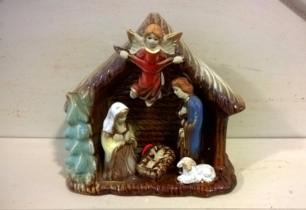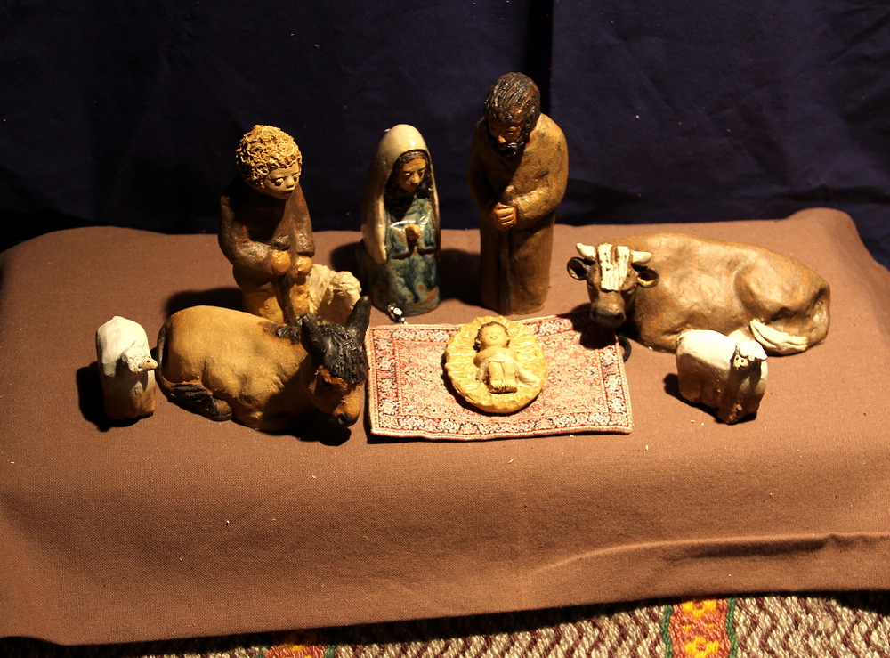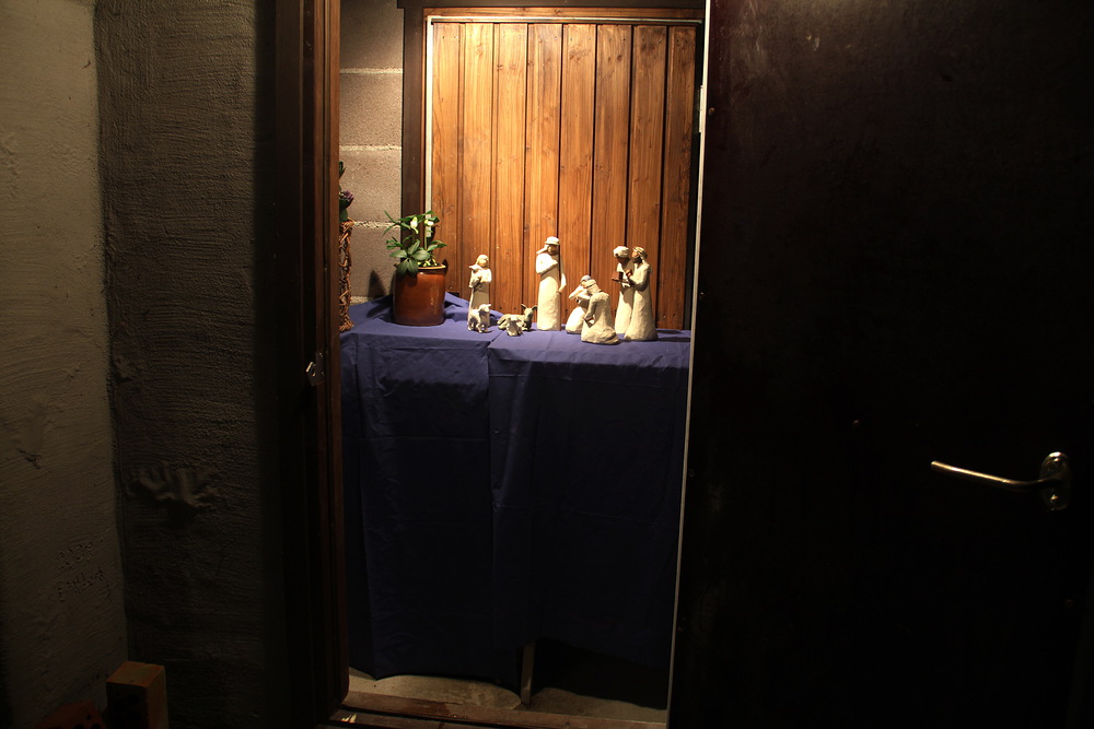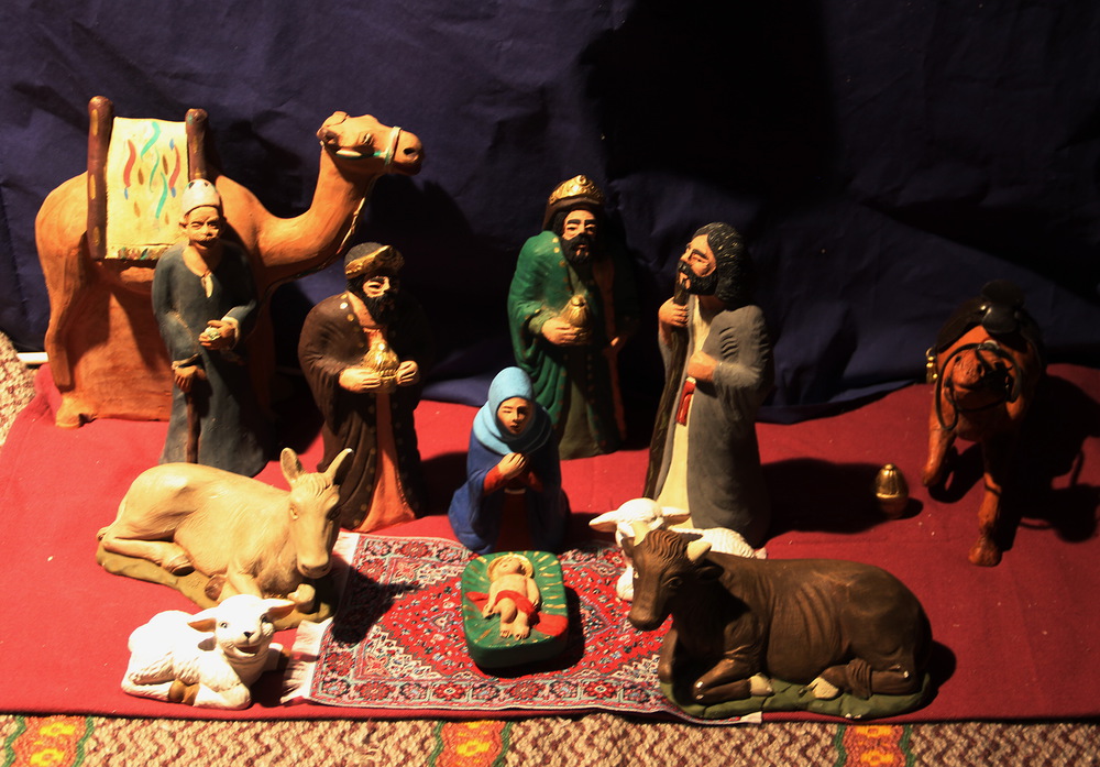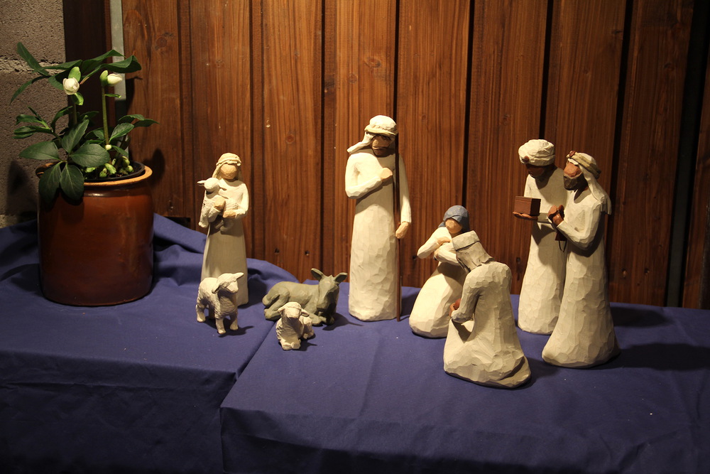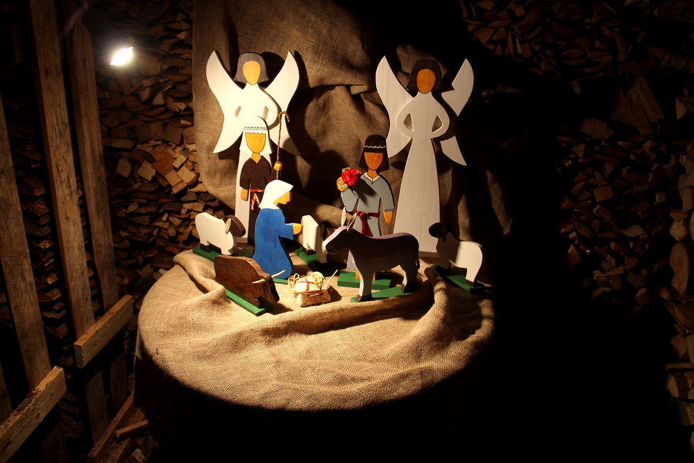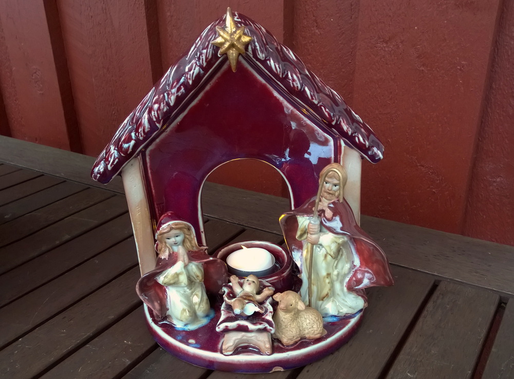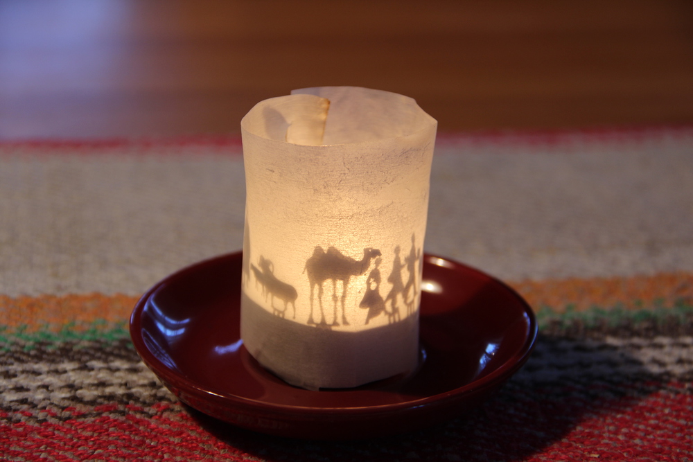 Tuikkukynttilän valo heijastaa seimihahmojen varjo...