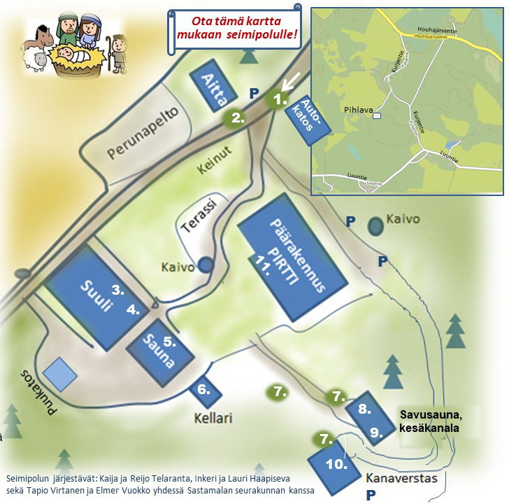 Keskiviikkona 13.12.2017 järjestettiin Pihlavan pirttimme pihapiirissä ja sen ulkorakennuksissa jo perinteeksi tullut seimivaellus. Seimipolulla vaeltavat saivat katsella eri maista tuotuja ja hyvinkin erilaisia jouluseimiä, jotka kaikki kertovat Jeesuksen syntymisestä Betlehemin tallin oljille.
