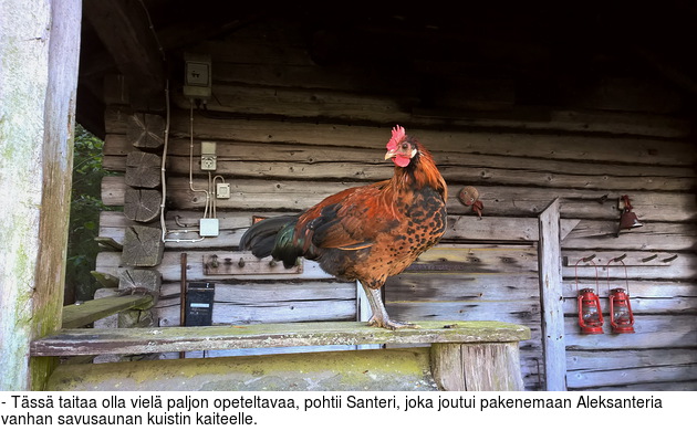 Kaikki sujui kodikkaan leppoisasti siihen saakka, kun nuori punaruskea kukko Santeri alkoi kiinnostua kanoista tosi tarkoituksella. Hormonien nostattamaa intoa ja ripeyttä löytyi, mutta tekniikassa oli vielä paljon hiottavaa. Santeri yritti saada aikuisia kanoja juoksemalla kiinni ja kun se sai hiukan nokkaotetta kanan tukkahöyhenistä, kana alkoi huutaa kuin tapettava sikapossu.