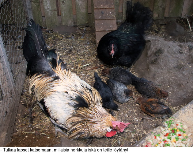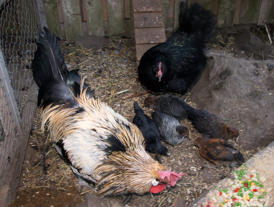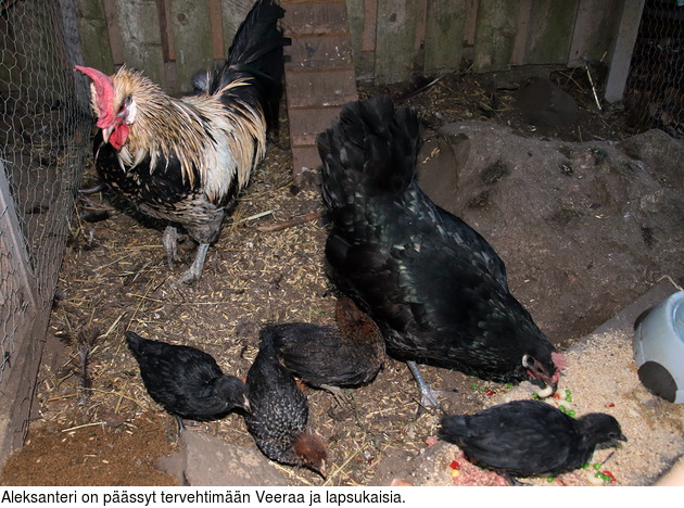 Eräänä päivänä huomasin, että kukko Aleksanteri seisoskeli kanatarhan ulkopuolella katsellen verkon takaaVeeraa ja lapsukaisia. Toiset kanat olivat pihamaalla omissa touhuissaan ja kukko alkoi kutsua Veeraa syömään luokseen. Se kotkotti houkutusäänellä ja kuopi nokallaan maata ikään kuin siellä olisi joku herkku piilossa.
