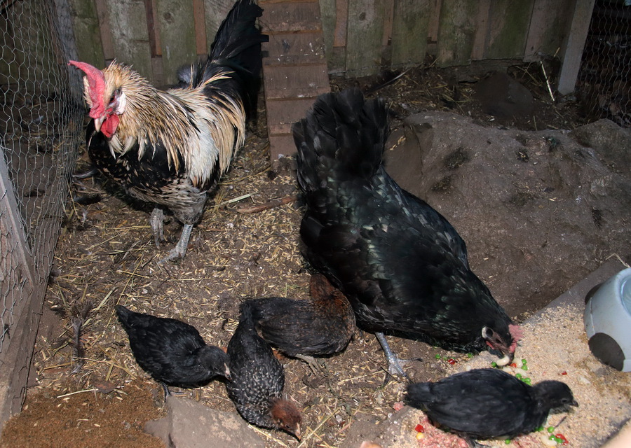 Ei tullut tappelua. Tuli oikein herkkä perhetapaaminen. Yhdessä ne söivät ja kuopsuttelivat pikkuisten touhutessa jaloissa. Yön Veera ja kukko nukkuivat vierekkäin orrella. Poikaset joutuivat nukkumaan ilman emon siipien suojaa lattialla. Onneksi niille oli tarjota lämpölamppu korvaamassa emon höyhenten lämpöä.