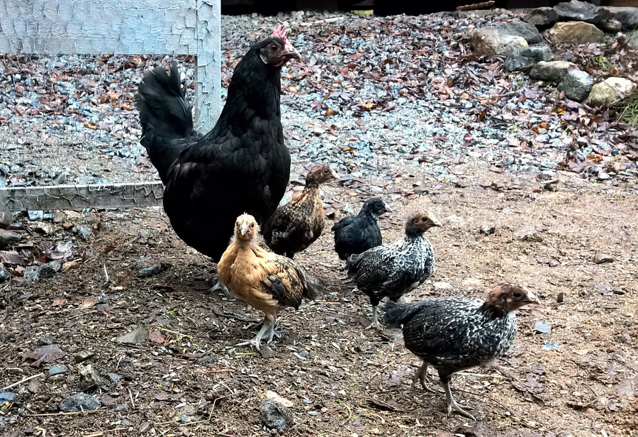 Koska ainutlaatuinen Föhn-tuuli lämmitti marraskuun alkupäivien lämpötilan yli kymmeneen plus asteeseen, Veera-kana uskaltautui viemään kuusi poikastaan ulos. Poikaset ovat hyvin reippaita ja ikäisekseen pontevia ja itsenäisiä. Liekö suotuisaan kehitykseen syynä leppoisat päivät uudessa kanalassa, jonne ne oli siirretty muutamaksi elämänsä ensimmäiseksi viikoksi kovilta pakkasilta turvaan.