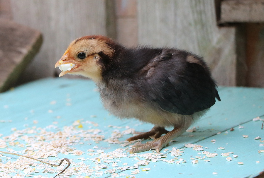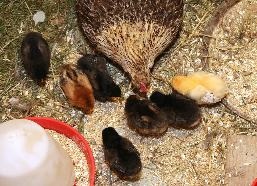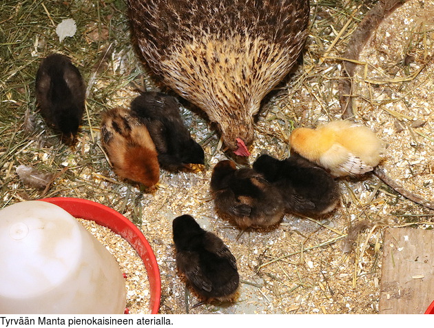 lämmössä, ja sitten jo taapertavat jaloillaan nokkimassa syötävää.