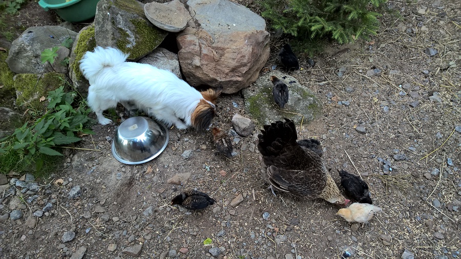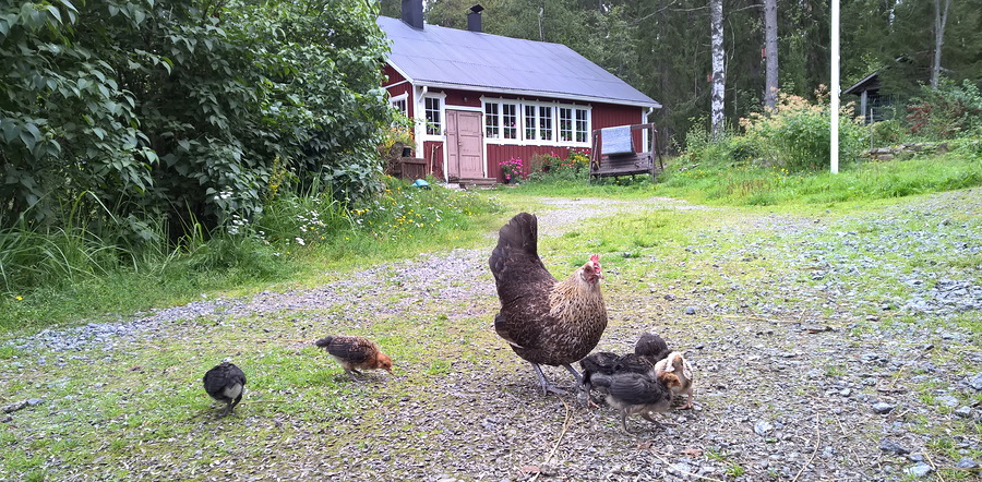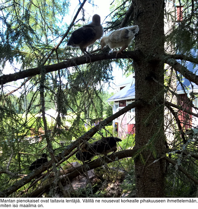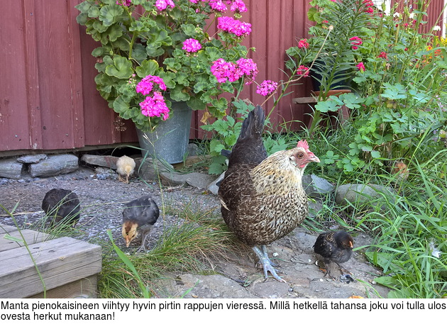 luukusta ulos aurinkoon. Emon perässä ne uskaltautuivatkin viimein pihalle. Kanaportaita