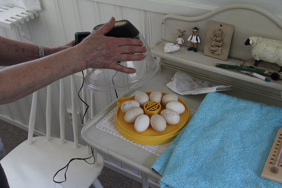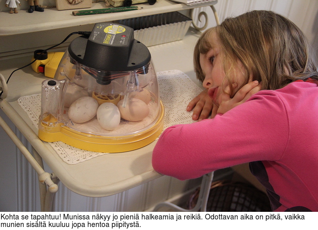 Kova homma on pikkuisilla nakertaa koko munan ympärille ura, jotta kansi poksahtaa pois. Laatikko ja lämpölamppu on jo valmiiksi viritetty. Aleksanteri Tuppille on kerrottu, että hänestä on tulossa isukki ja kaikista rouvista äitejä.