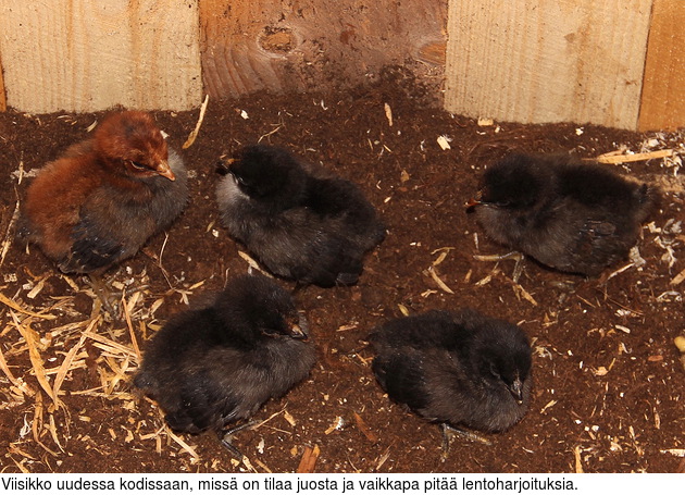 Avoimesta ovesta kukko ohjasi laumansa ensin ulos omasta osastosta, sitten muutaman metrin matkan käytävää ja viimein sisään toiseen osastoon. Siellä ne innoissaan kuopsuttelivat pehkukasaa. Kun menin sinne katsomaan, oli kukko sen näköinen kuin olisi sanonut: ”Sadepäivinä me saadaan aina olla täällä jumppasalissa.”