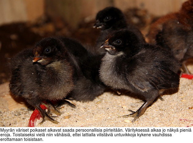 Niille on nyt kasvanut siipisulat ja pienen pienet pyrstösulat. Pyrstö on ihan liikuttavan söpö, aivan kuin voikukan siemenhahtuvat olisivat rivissä. Hiukan niihin on tullut myös eri värejä näkyviin, mutta tummat myyränväriset näyttävät kovin toistensa kaltaisilta.