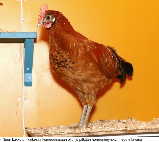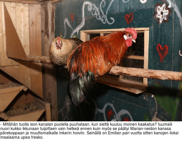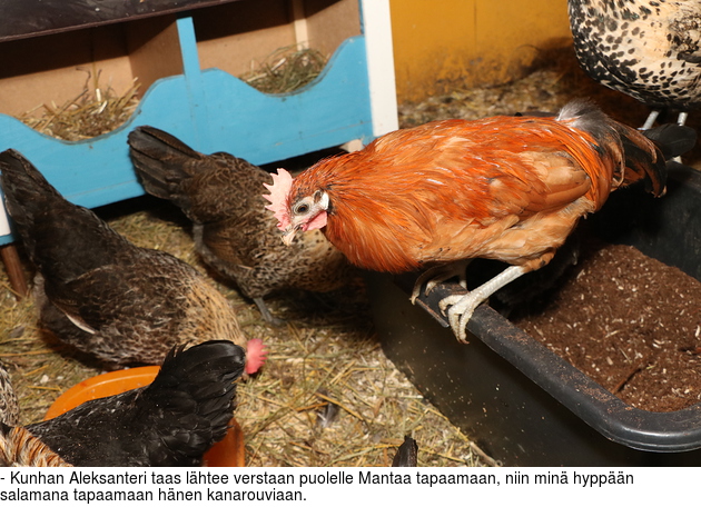 KAIJA: Eräänä päivänä, kun kukko Aleksanteri oli tervehtimässä Manta ressukkaa verstaan puolella, jäin katselemaan kanojen touhuja. Heti kun iso kukkomme Aleksanteri oli lähtenyt pois kanalasta, siellä alkoi vallita epäjärjestys ja pelko. On totta kun laulussa sanotaan että " Kukko kanatarhan turva on, isännälle emännälle aamun airut verraton". Kanaparven seuraksi jääneellä nuorella kukolla ei ollut käytöstapoja eikä herrasmiehen elkeitä, kun se veti nokallaan pesästä ulos vanhan Ruustinna kanan ja sääliä tuntematta ryhtyi toteuttamaan elämänsä tarkoitusta.