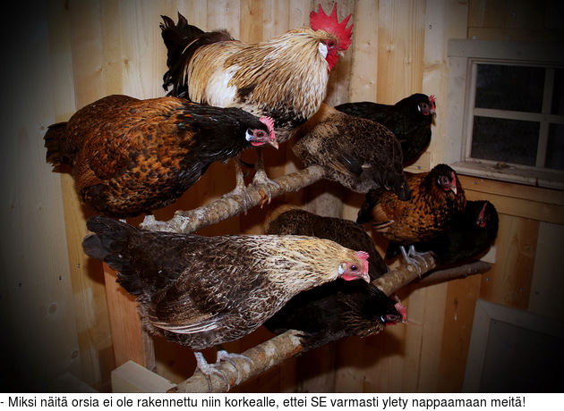 oli hypännyt ylimpiin munintapesiin. Loput kanat hyppivät orsille ja alas ja