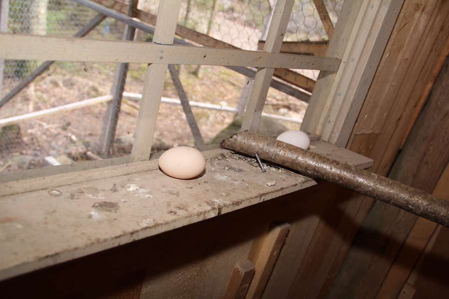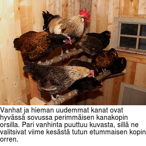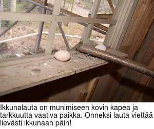Kaija: Kahden kanakopin asuttaminen aiheutti uusia pulmia. Koska olimme suunnitelleet sopuisaa yhteiseloa uudessa suuressa perheessä, ei munintapesiä ollut kuin toisessa kopissa. Hämmästyimme, kun munia pyöräytettiin lattialle nurkkaan ja yhtenä aamuna oli kaksi munaa ikkunalaudalla. Toinen oli normaali kovakuorinen ja sen vieressä pehmeäpintainen nahkamuna. Olivatkohan ne tulleet samalta kanalta tupsahtamalla sellaisella vauhdilla, että samalla ponnistuksella putkahti jo seuraavan päivänkin muna?