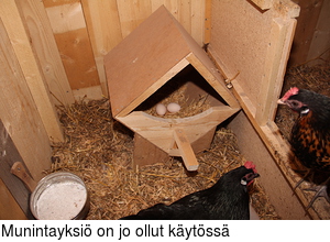 Onneksi Reijolla on vasara ja nauloja ja altis mieli. Nopeasti hän sai aikaan sievän munimisyksiön. Piti asentaa myös lisää orsia tälle kuuden kanan laumalle.