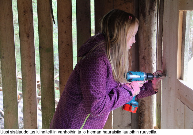 Kun kaikki vuosikymmenien aikana liiteriin kannettu tavara oli viimein saatu ulos, oli jäljellä harvaan laudoitetut seinät, peltikatto ja maalattia. Siitä oli hyvä aloittaa.