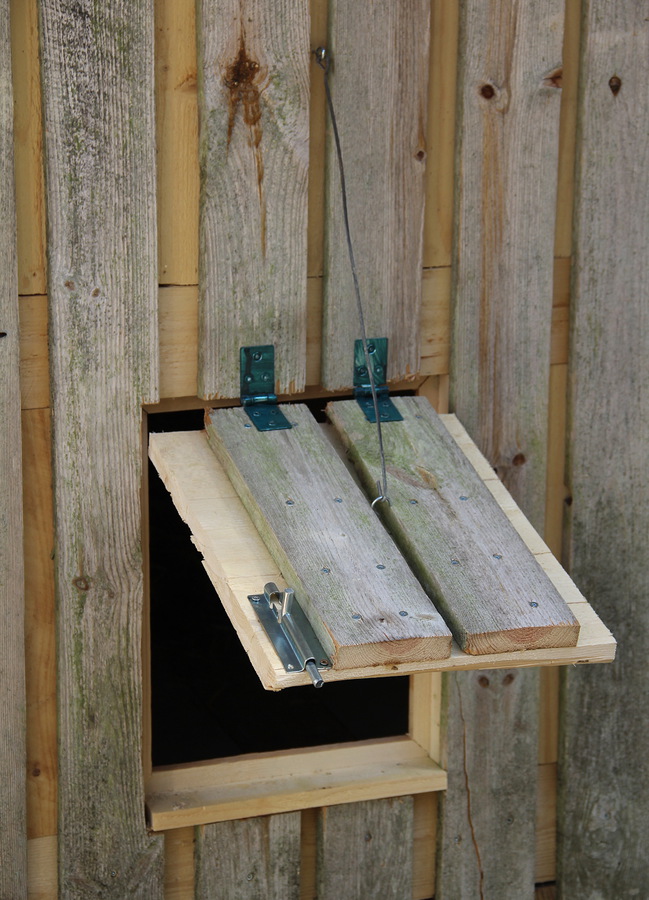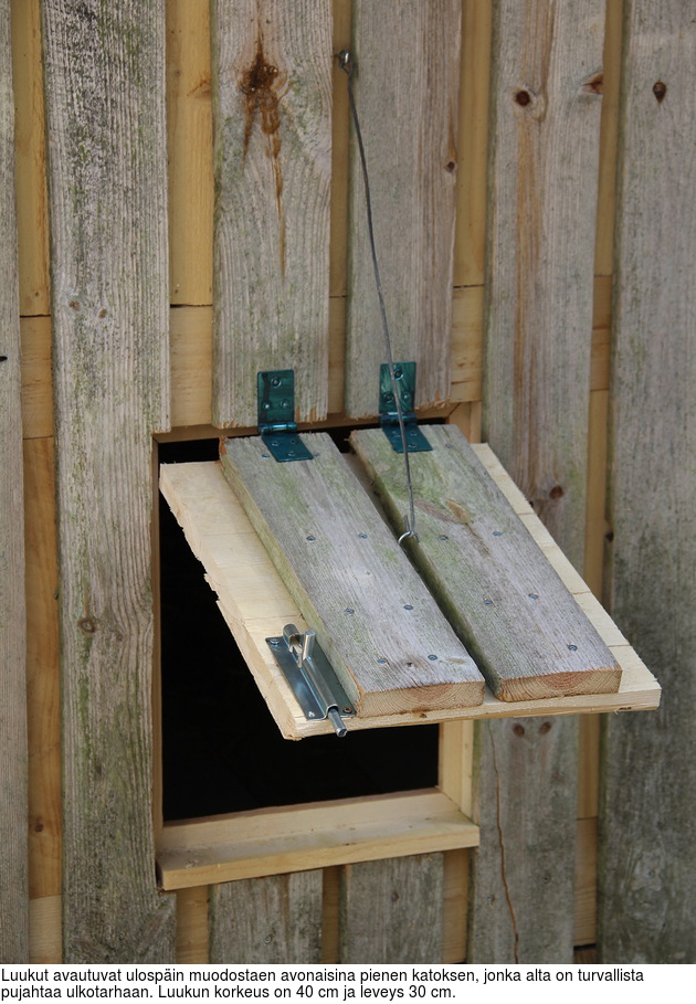 Jo edellä mainittujen työvaiheiden yhteydessä olin tehnyt liiteriin ikkunan. sekä kanoille ulkotarhaan pääsyä varten kaksi luukkua. Yhdelläkin pärjää, mutta kahden kautta käy kesähelteillä tuuletus tehokkaammin, ja samalla kanoilla on vaihtoehtoisia väyliä käytettävissään.