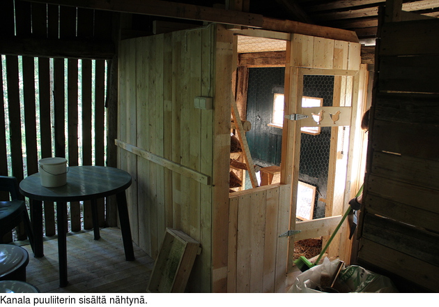 Kun koko liiteri oli saanut lattian, rakensin sen yhteen nurkkaan varsinaisen kanakopin. Laudoitin harvan seinälaudoituksen sisäpuolelta umpeen 150 mm sahalaudalla. Yhden 2 m korkean umpiseinän tein rakennuksen harjan alle sen suuntaisesti. Neljännelle seinälle rakensin paikat ovelle sekä verkkoseinälle. Myös sille seinälle tein alas 40 cm korkuisen umpilaudoituksen, etteivät purut ja oljet lentäisi kanojen ruopsutellessa ulos kanakopista.
