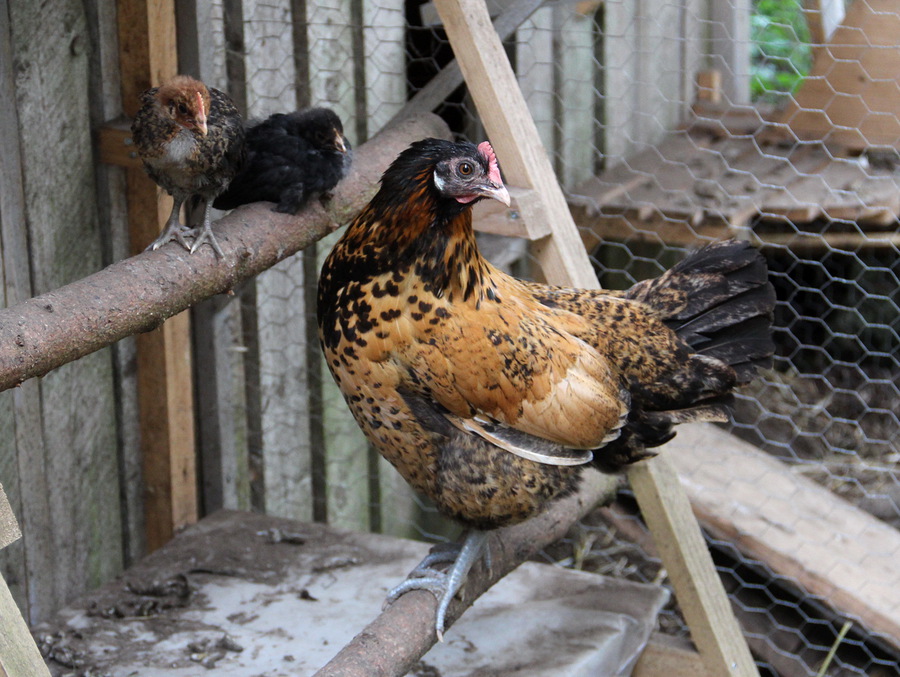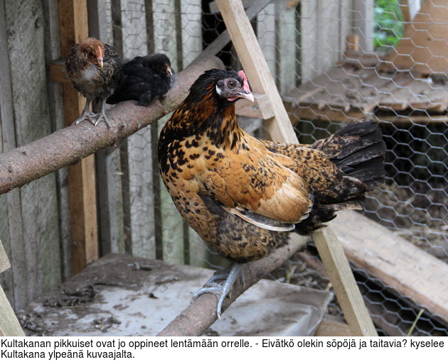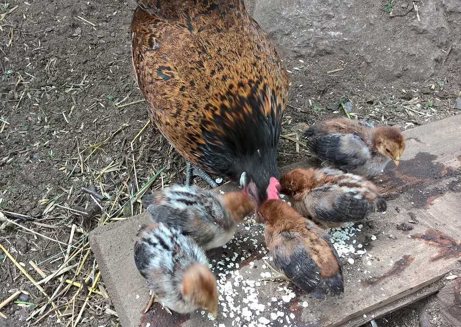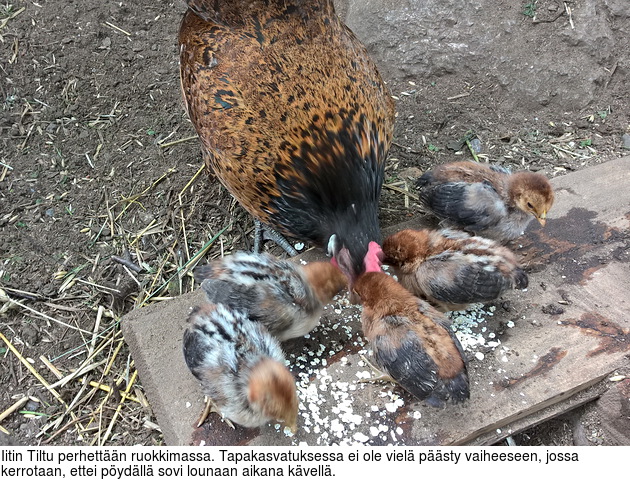 Onhan kaksosissakin paljon hoitamista nuorella emolla, ja se oli heti innolla syöttämässä niitä. Kun kana etsii ruokaa poikasille, se ei suinkaan syötä niitä lautaselta, vaan viskoo sapuskat maahan, kuopii ja pöllyttää niitä ympäriinsä ja kertoo kotkotuksella: "Katsokaa, mitä äiti on taas löytänyt!"
