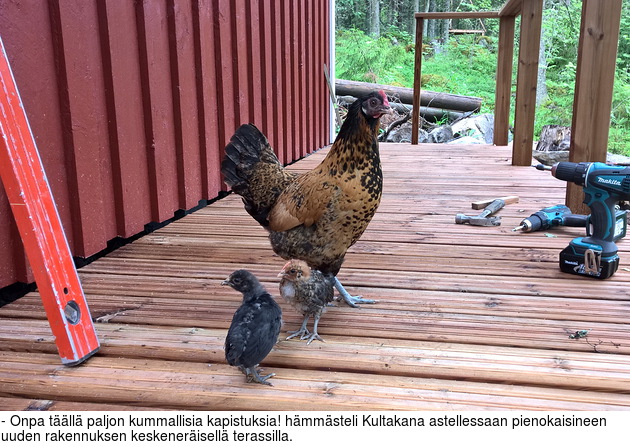 puolilämmin varastorakennus. Kanat ovat kukon johdolla käyneet tutustumassa
