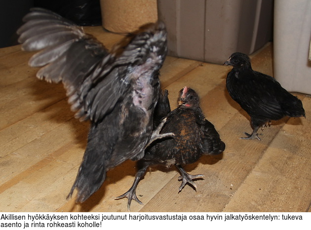 Hankalaksi tilanteen tekee, että elämää pitemmälle eli ensi vuoteen ajatellen tuossa joukossa on kukkoja kaksi liikaa. Vain yksi voi kasvaa aikuiseksi ja jatkaa sukua. Kahden muun kohtalona on jonain koleana ja synkkänä syksyisenä päivänä päätyä keittiöön.