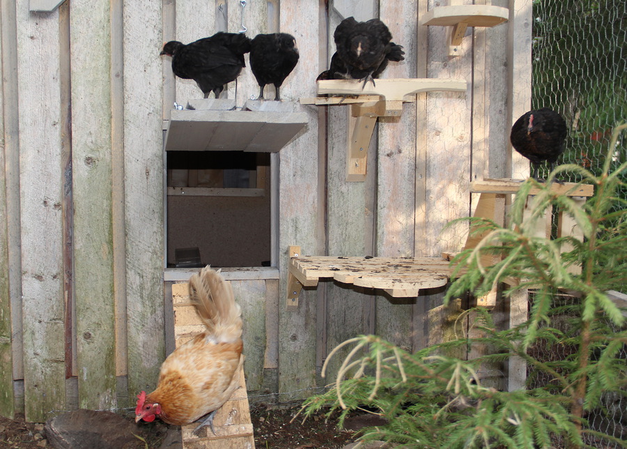 Kun pysähdyn tarhaan asentamaan niille jotain uutta voimistelutelinettä, viisikko nokkii samaan aikaan kengännauhojani auki. Jos kumarrun ja ojennan käteni, jossa on kananrehua, porukka kokoontuu epäröimättä ja lainkaan pelkäämättä nokkimaan herkkuja.