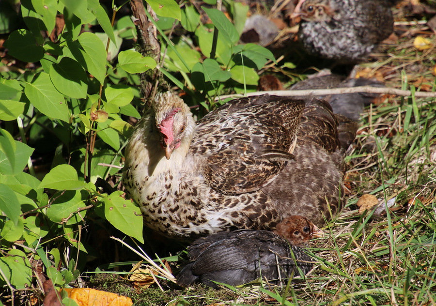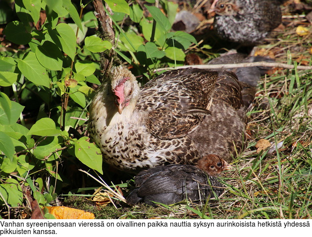 kukko isojen kanojen kanssa, etsimään syötävää ja nauttimaan auringon lämmöstä.