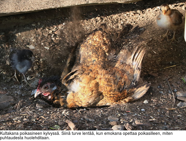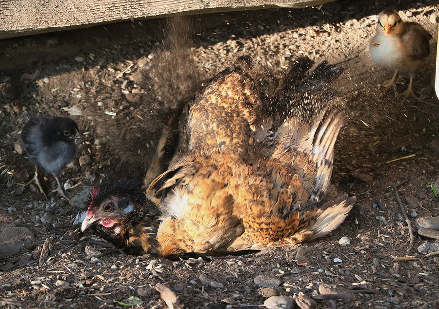 Kaikki kanat ja kanaemot ja poikaset piiloutuivat pensaisiin ja kukkapenkkeihin. Ne olivat ihan hiljaa pitkiä aikoja varmistaakseen, että vaara on ohi. Pieniä untuvikkoja oli piiloutuneena ojaan ja kellarinkatolle vuorenkilpien alle ja meni kauan ennen kuin kaikki emot löysivät lapsensa.
