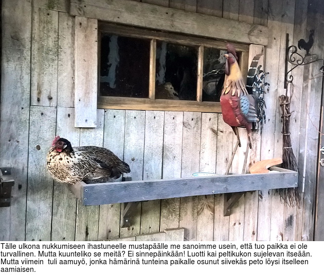 Toisena päivänä saapui peto. Keskellä päivää alkoi pihalta kuulua hirveä kaakatus ja ryntäsimme ulos katsomaan, mikä on hädän syy. Toisinaan kanat saavat laulukaakatuskohtauksen ilman mitään näkyvää syytä, sanon sitä " Taivas putoaa varoituslauluksi". Nyt siis oli todella syytä kaakattaa ja kotkottaa sillä pihalla juoksi kaunis pulska ruskea kettu ja jahtasi kanoja. Saimme sen peloteltua takaisin metsään, mutta yhden poikasen se oli ehtinyt napata. Nurmikolle oli jäänyt kasa harmaita höyheniä muistoksi.