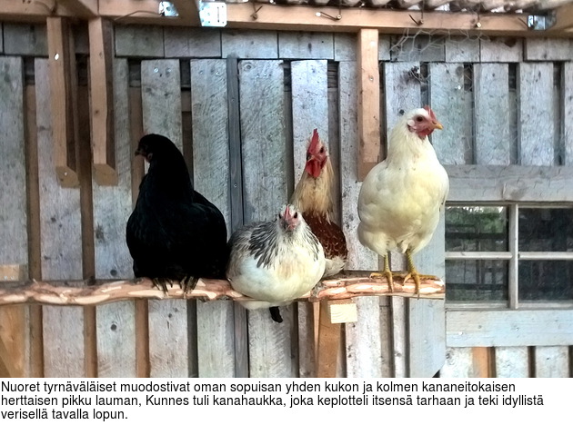 Valitettavasti kanahaukka ehti ensin ja kohta ei ollut mitään myytävää. Haukka oli tunkenut itsensä sisään tarhaan kattorakenteiden raosta ja raadellut kanapoloiset. Kahdessa oli pikkuisen elämää jäljellä mutta ne päästettiin vaivoistaan. Oli aika murheellista siivota höyheniä tarhasta ja harmitella nuorten kanojen kurjaa kohtaloa.