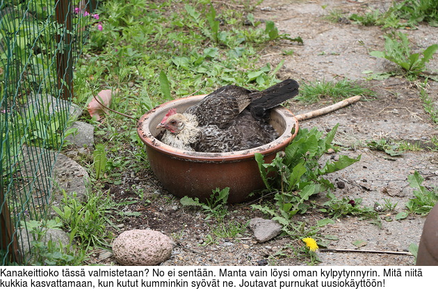 Kaija: Kanojen mielestä tämä viileä ja valoton kesä oli aivan paras mahdollinen hautomiskesä. Kultakaulakana aloitti hautomisen maaliskuussa ja se hautoi myös kesäkuussa toiset poikaset ja kolmannen haudonnan se päättäväisesti aloitti syyskuun lopulla. Kymmenen sen toveria hautoivat myös ja vaikka munia oli useimmilla vain kaksi tai kolme, niin kanalauma kasvoi hurjasti.