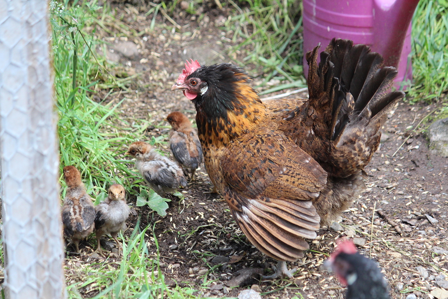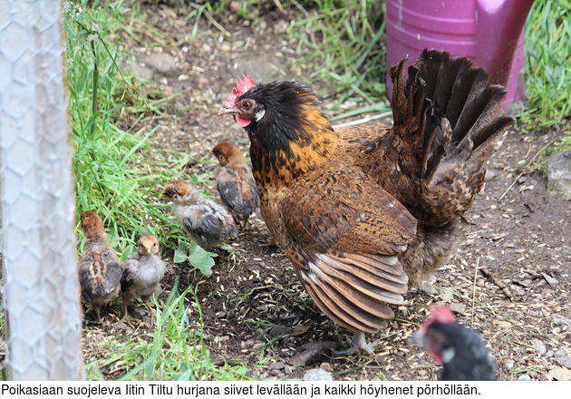 Noista ajoista on perhelainsäädäntö tiukentunut. Täytyy ottaa huomioon myös kukko Aleksanterin isän oikeudet. Nyt kun Tiltun viitoset ovat 2 viikon vanhoja, se kulkee poikasineen toisten joukossa. Eilen näimme herkän hetken, kun kukko kävi niitten luona ja kauneimmalla kukon äänellä leperrellen esitteli poikasille ruokapaloja: "Näin iskä teistä huolehtii."
