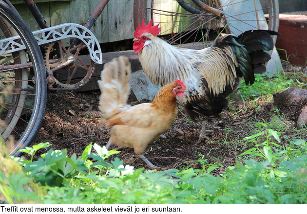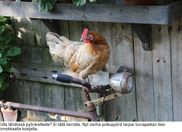 orrelle ja kukko hyppäsi perässä. Ulla lähti lentämällä karkuun mutta törmäsi