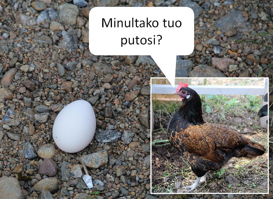 KAIJA: Olen ulkoiluttanut kanoja joka päivä tarhan ulkopuolella. Se on hauskaa seurattavaa ja ne myös tykkäävät maistella kaikenlaisia siemeniä, marjoja ja lehtiä. Eilen ihmettelin Ruustinnaa, joka ei päässyt liikkumaan eteenpäin. Toiset olivat jo tulleet kauas tarhasta, mutta Ruustinna kökötti kuin krampin saaneena hiekkapolulla. Sitten se nousi seisomaan ja tepasteli eteenpäin taakseen vilkaisematta. Kaunis valkoinen muna oli ilmestynyt hiekalle.
