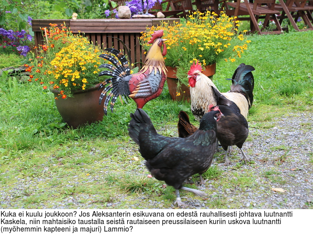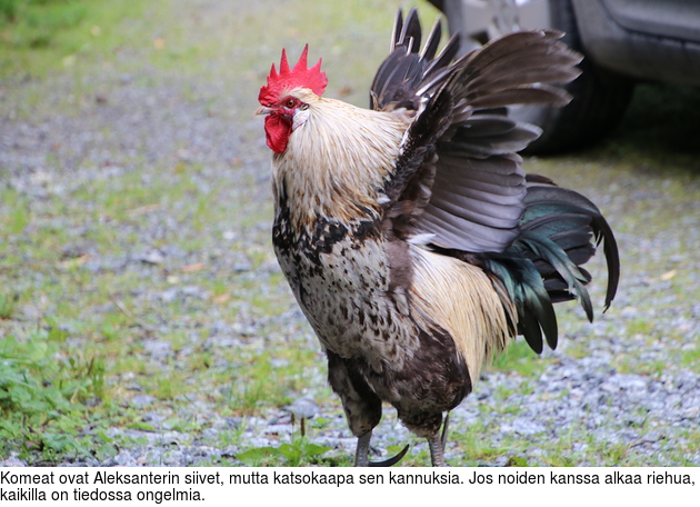Kurittomat kukot ovat saaneet tällä kerralla päähuomion. Päättääkseni tekstini myönteisissä tunnelmissa kerron hieman kukkomme Aleksanterin kuulumisia. Viime kesänä jo ennätin luonnehtia sitä Tänä kesänä ei ole ilmennyt ainuttakaan syytä korjata lausuntoani.