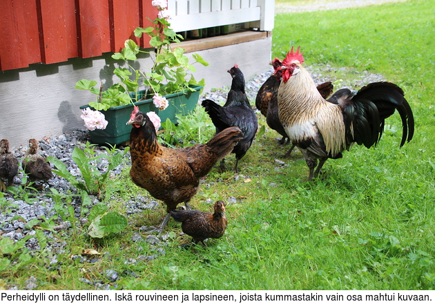 Reijo: On kukkoja, jotka vainoavat pihamaalla liikkuvia lapsia. Myös sellaisia löytyy, jotka käyvät siekailematta emännän kimppuun, mutta jättävät isännän rauhaan. Tai toisin päin. Jotkut punaheltat riepottelevat kanarouviaan, niin että touhu täyttää vainoamisen ja väkivaltaisen ahdistelun tuntomerkit. Millainen kukko, sellainen on tunnelma kanalassa ja sen läheisyydessä.