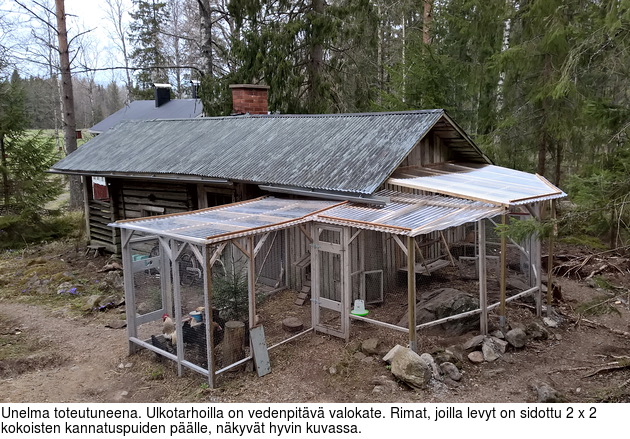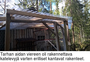 Alkuperäinen tarha oli tehty maastoa vapaasti seuraillen ja pahimpia kiviä kiertäen. Niinpä jouduin tekemään sen ulkopuolelle erillisen kehikon, jonka päälle kattolevyt oli mahdollista kiinnittää. Metallisiin maakiiloihin laittamani pystytolpat tein painekyllästetystä 5 x 5 cm puusta. Muut rakenteet ovat tavallista puuta.