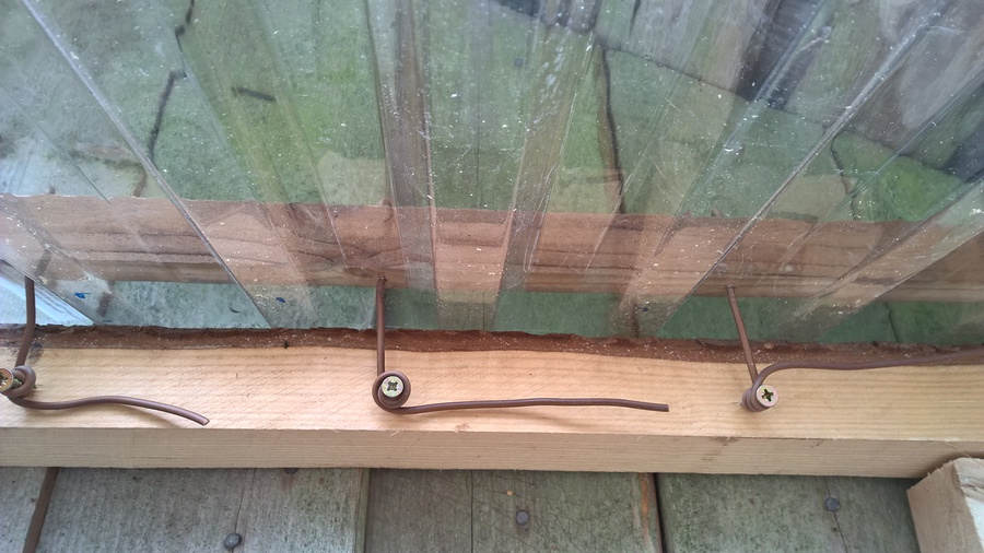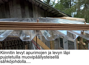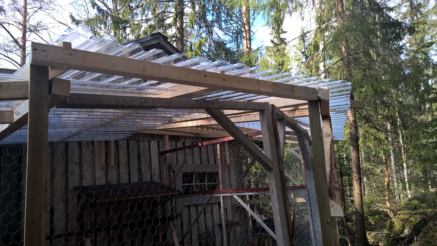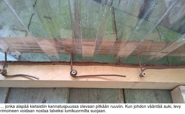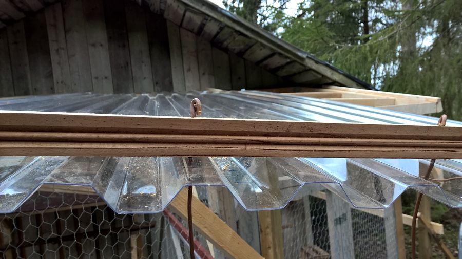 Polykarboinaattilevyn hyviä puolia ovat kirkkaus ja keveys. Huono puoli on se, että kestääkseen talven lumikuormat levy tarvitsee alleen tukevan ja riittävän tiheän alustan. Kanatarhaan sellaista ei olut mielekästä eikä käytännössä mahdollistakaan rakentaa. Niinpä minun oli kiinnitettävä levyt rakenteisiin tavalla, joka kestää myrskyt, mutta on samalla helposti ennen talvea purettavissa ja keväällä jälleen paikoilleen asennettavissa. Se, miten asian hoidin, selviää kuvista teksteineen.