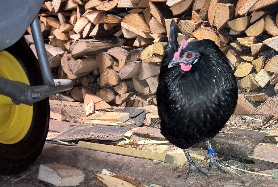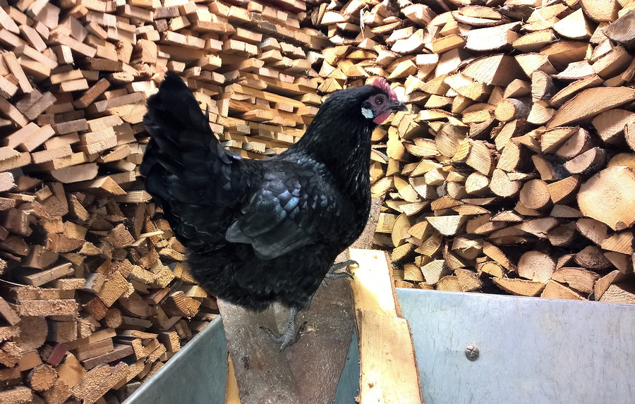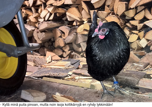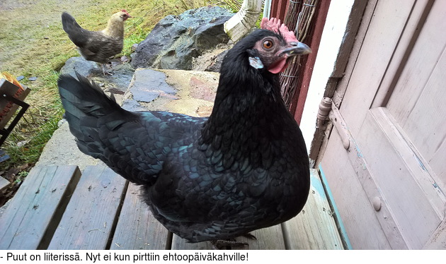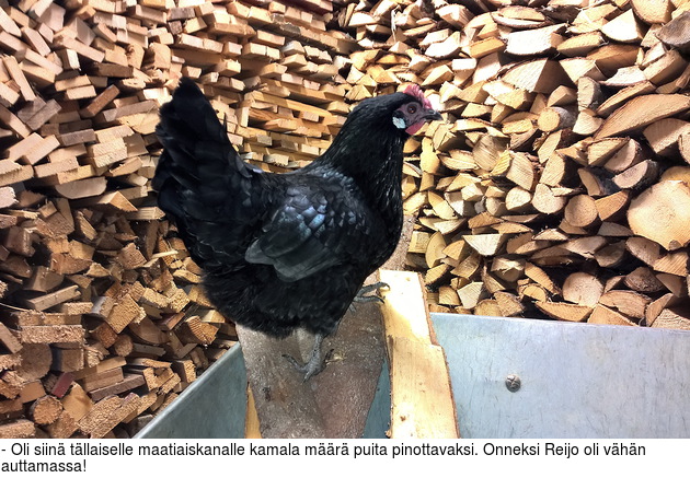Päivisin Vermutti on itsekseen tai Reijon kanssa liiterissä puita pinoamassa. Vermutti ei kanna puita mutta on hyvänä seurana. Kumma kana.